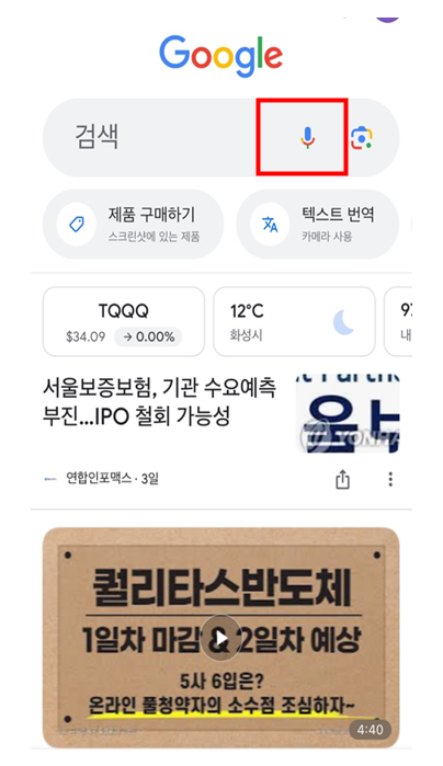 1.구글 앱을 실행해주고 오른쪽 상단 마이크 모양을 클릭합니다. 참고로 구글 허밍앱은 안드로이드에서만 사용 가능하고 아이폰 유저들은 사용 불가능합니다.